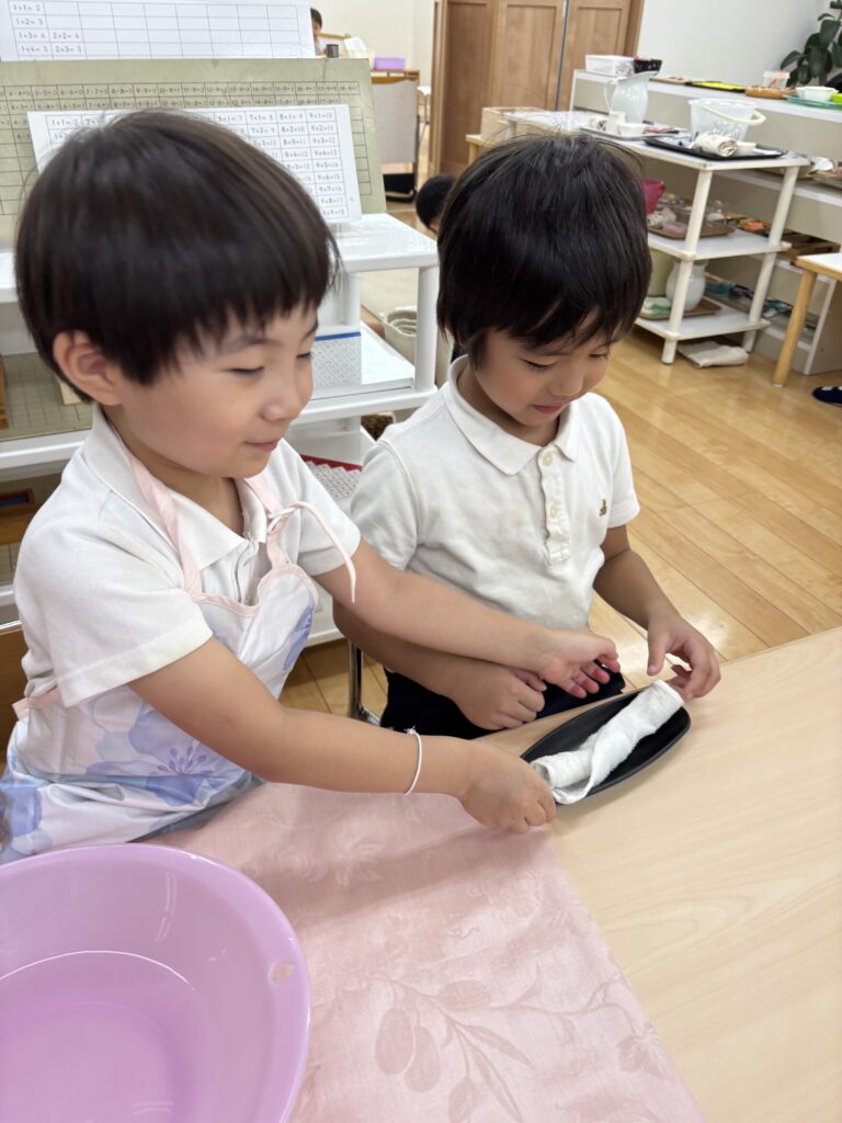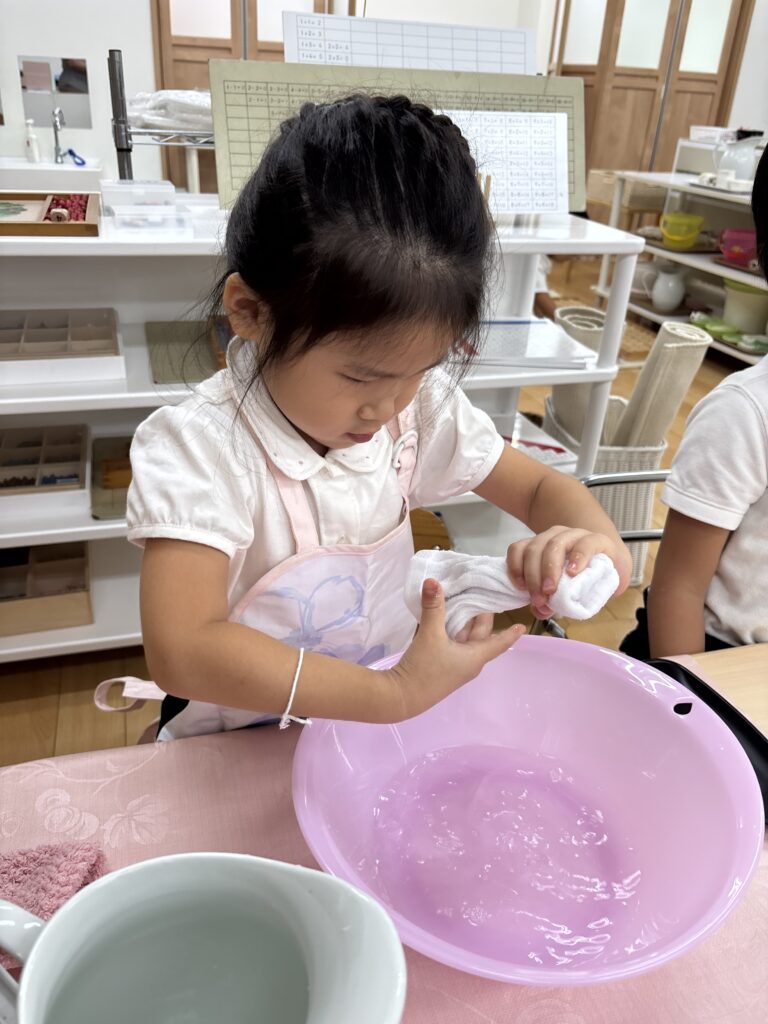 モンテッソーリ教育では、水を使った活動で『タオルを絞る』活動があります。絞る作業を繰り返し練習できるように、道具が準備されていますので、活動の紹介をしました🍀