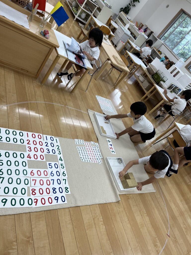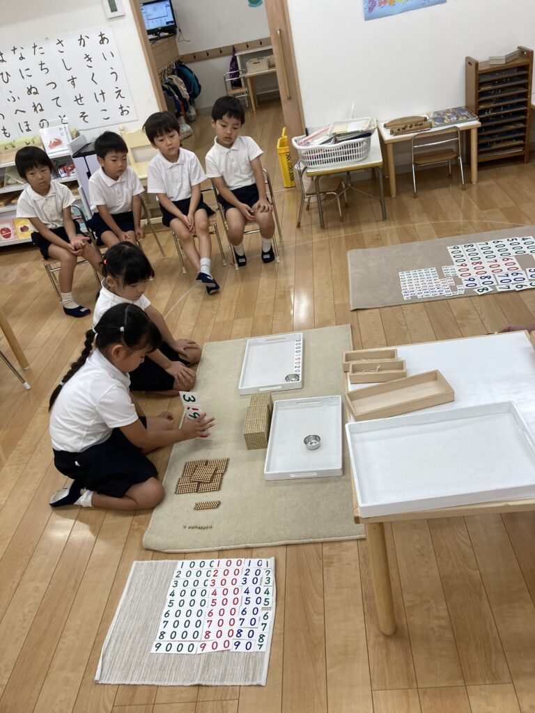 モンテッソーリ教育の『数教育』の分野では、ビーズとカードを使って感覚的に数の概念を吸収する活動を行っています。