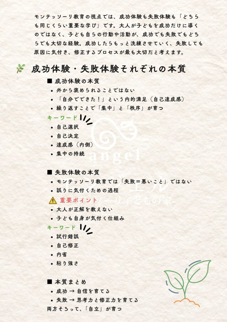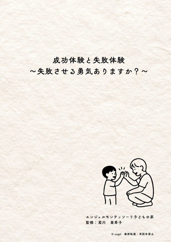 モンテッソーリ教育の視点では、成功体験も失敗体験も「どちらも同じくらい重要な学び』です。子どもから『失敗体験』を奪うことは、学びを奪ってしまうことと同じことに。